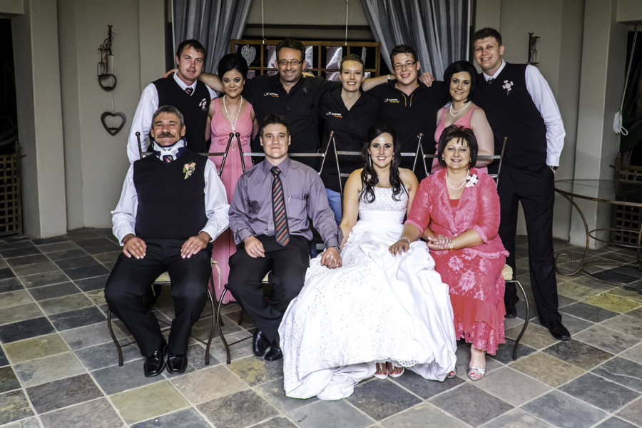 A very special wedding, not only for the couple, but for me personally.I just love this whole family, I photographed the weddings of all three children in the family, and I consider it a HUGE honour that they all three chose me as their wedding photographer. We also did the videography at all three weddings. Thanks Anneli, Hein, Melissa, Schalk, Annelize and Charles. Some of the most special memories of my life will always be your three weddings. Here is a photo of Surika, Timothy and myself with the whole family (this one is going on my wall)